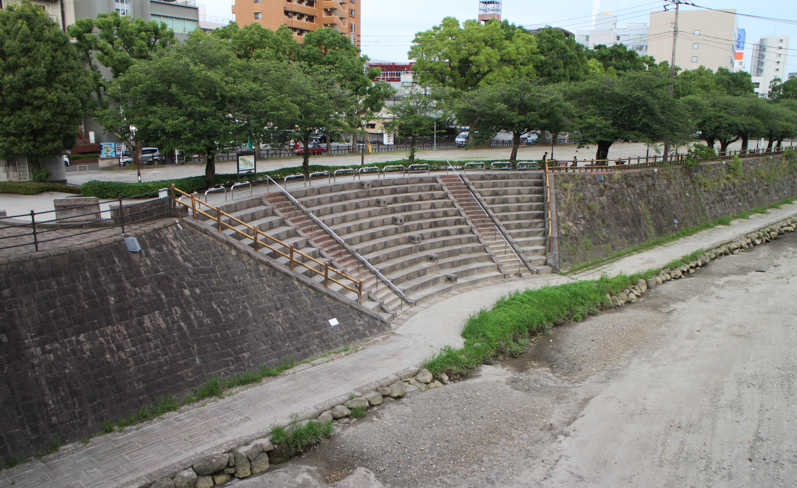 Vy över floden Kōtsukis torra bädd från Nishida-bron (西田橋) vid Lyons Park i Kagoshima. På andra sidan bron, vid samma fäste, står ett minnesmärke över offren för översvämningen 1993.