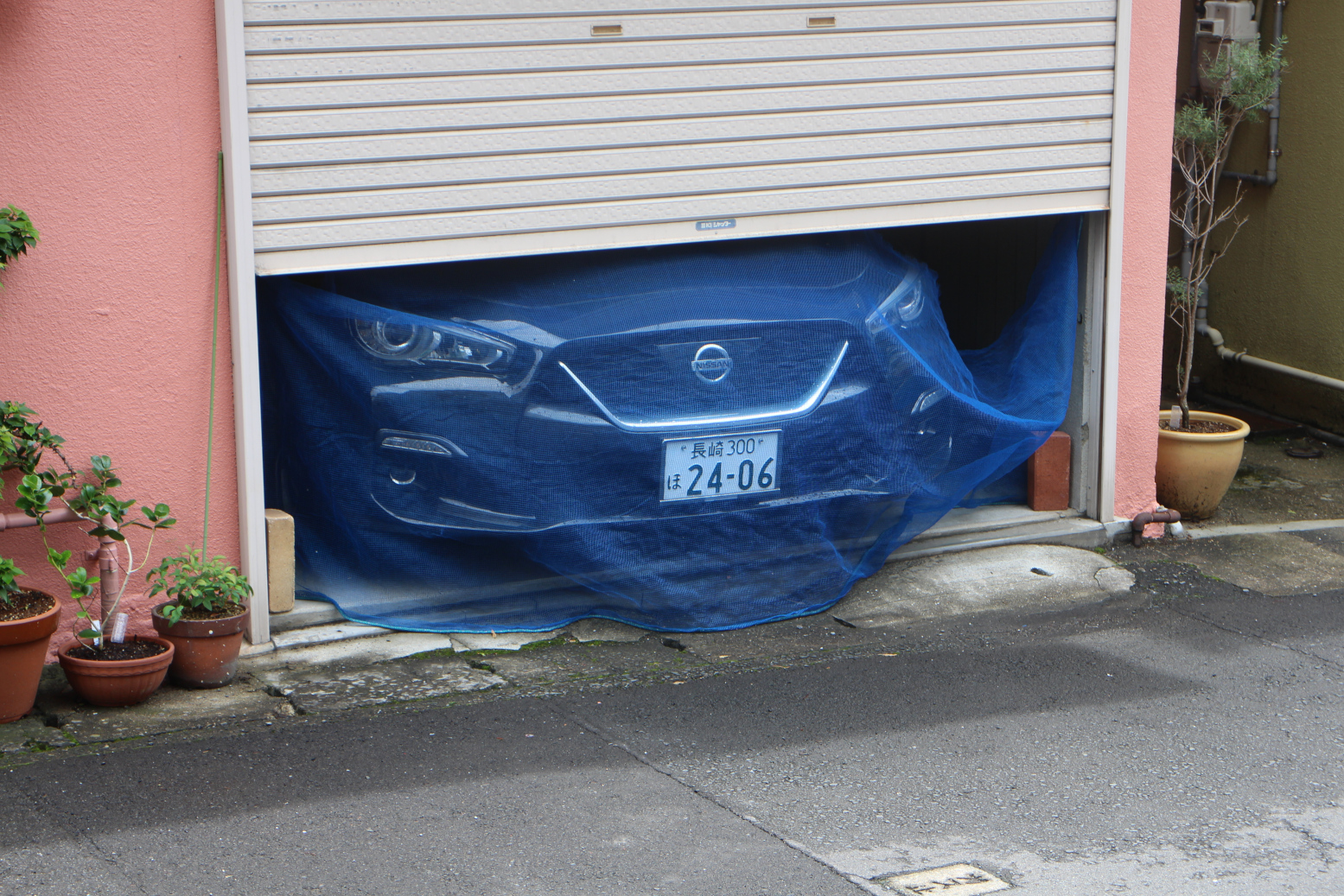 På stadsvandring genom centrala Nagasaki. Jag har hört det sägas att den som köper en bil i Japan måste ha en parkeringsplats som är tillräckligt stor för bilen. Youtubern Chris Broad hävdar rentav att polisen mäter din parkering innan du får bilen, men här gick det snett.