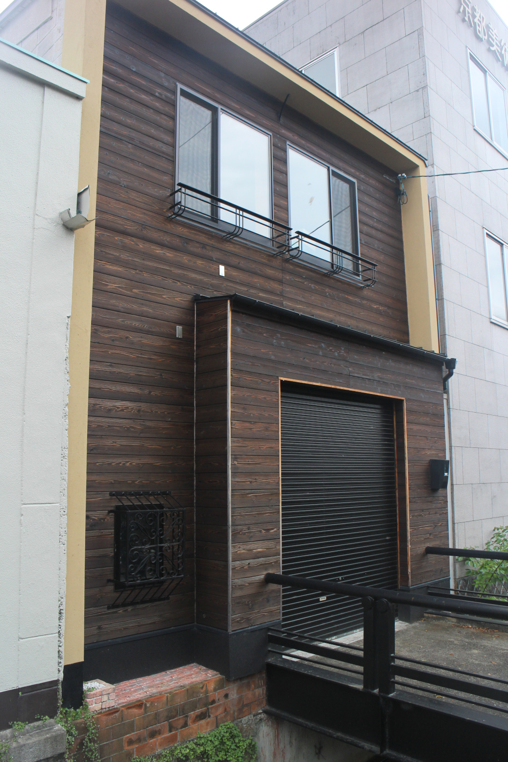 Det här nybyggda eller nyrenoverade enfamiljshuset i östra Kyoto ligger vid en av Gions små kanaler, så att garaget vetter mot en egen bro.
