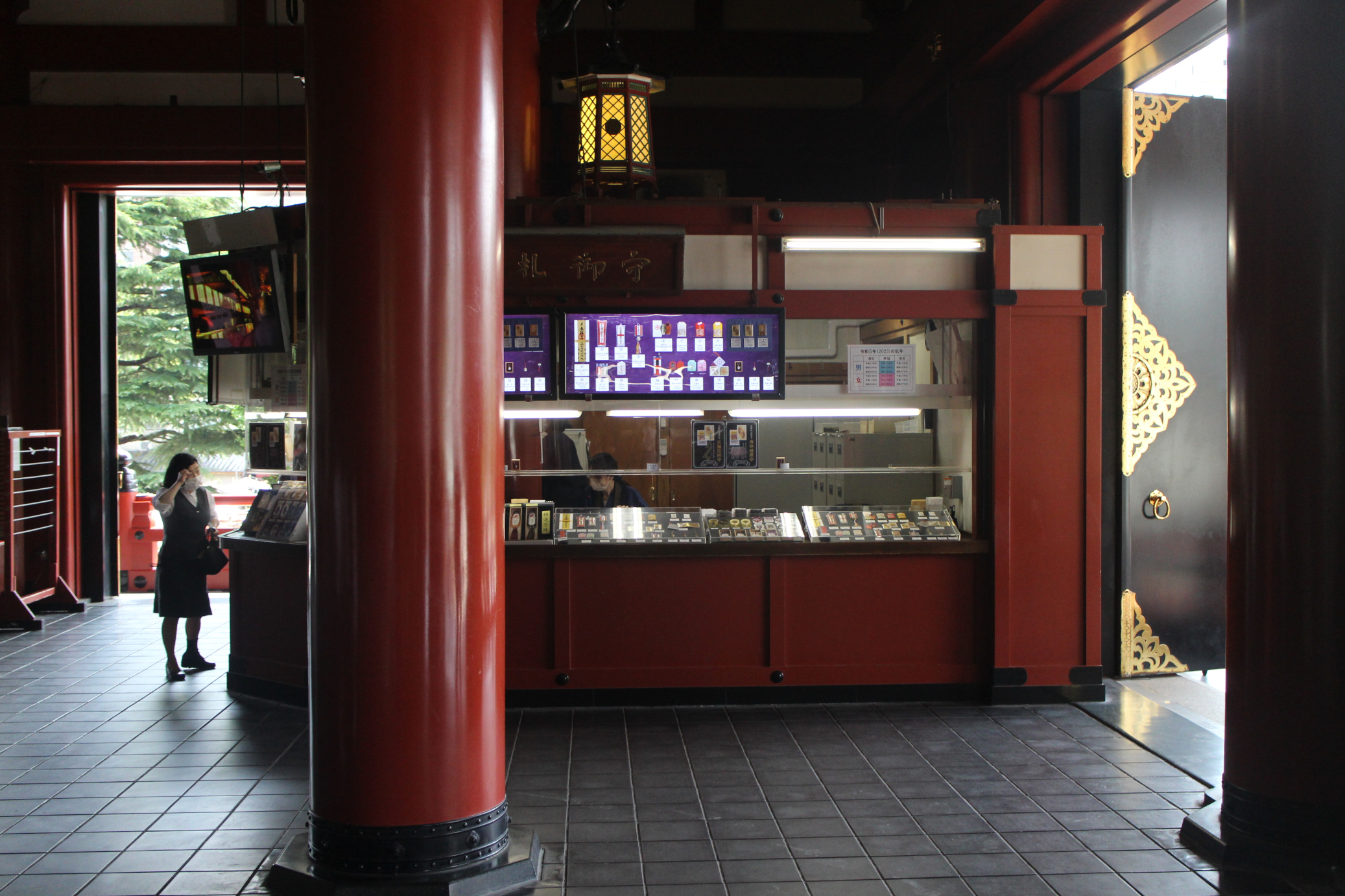 På skylten står det 礼御守, tacksamhet och skyddsamuletter. Affären står inuti Sensō-jis stora hall. Tur att Jesus inte ser det här.