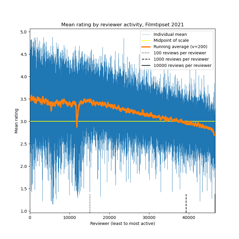 The y axis shows the personal mean rating set by each reviewer, and a running arithmethic average of those data points, in a moving 200-reviewer window to show the general trend. The running average is not weighted by the rising number of ratings moving to the right.
