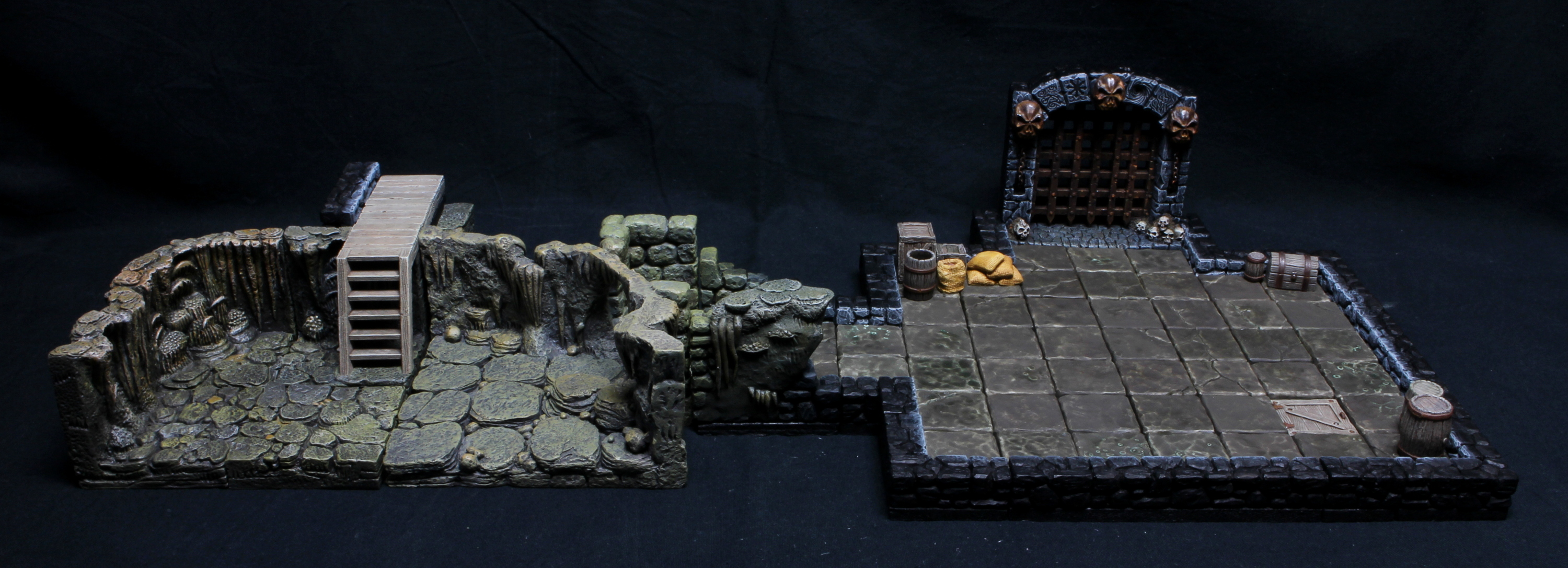 The walls are abbreviated on the HA stuff, and painted on the inside only, to make it easier to build, store and use these pieces. The one-sidedness is meant to suggest a claustrophobic subterranean world. The transition piece in the middle goes from one style to the other.