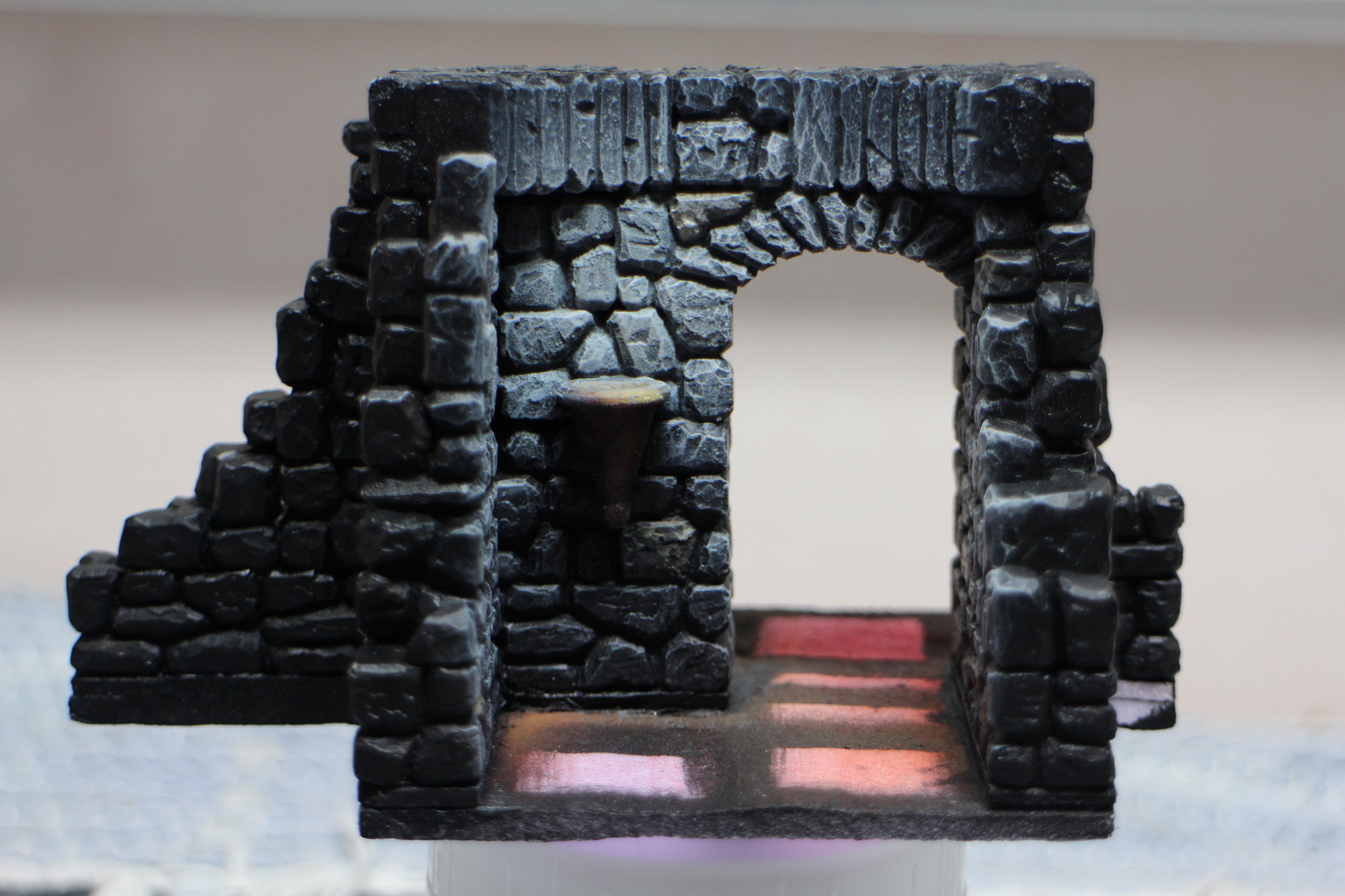 Notice the red tinge on the XPS substrate. This is actually the second time painting the same piece. The first time around I brought the walls up to precisely the same state as you see here—black foundation with grey drybrushing and some beige stones—and then I tried to airbrush on the coloured portion of the lighting effects. My paint wasn't thin enough, I got a little blockage in the airbrush, and suddenly the red was far too strong. Damage done, I continued applying brighter colours with similar coverage, hoping to fix the problem with ink washes. I failed and had to start over with a fresh coat of black.