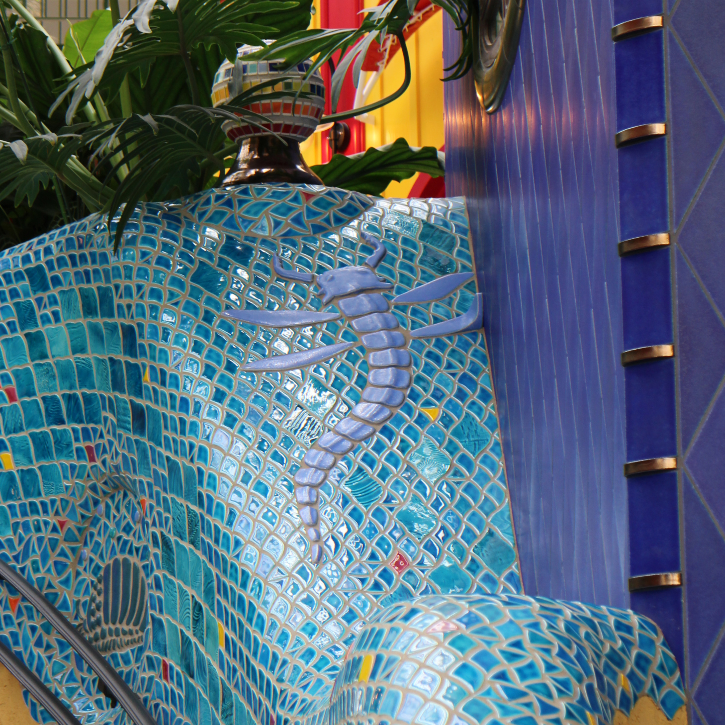 En jätteinsekt från Nausicaä of the Valley of the Wind (1982) vid sidan av en trappa upp mot lekstugan. Lägg märke till hur en av dess vingar är böjd upp ur mosaiken mot väggen intill.
