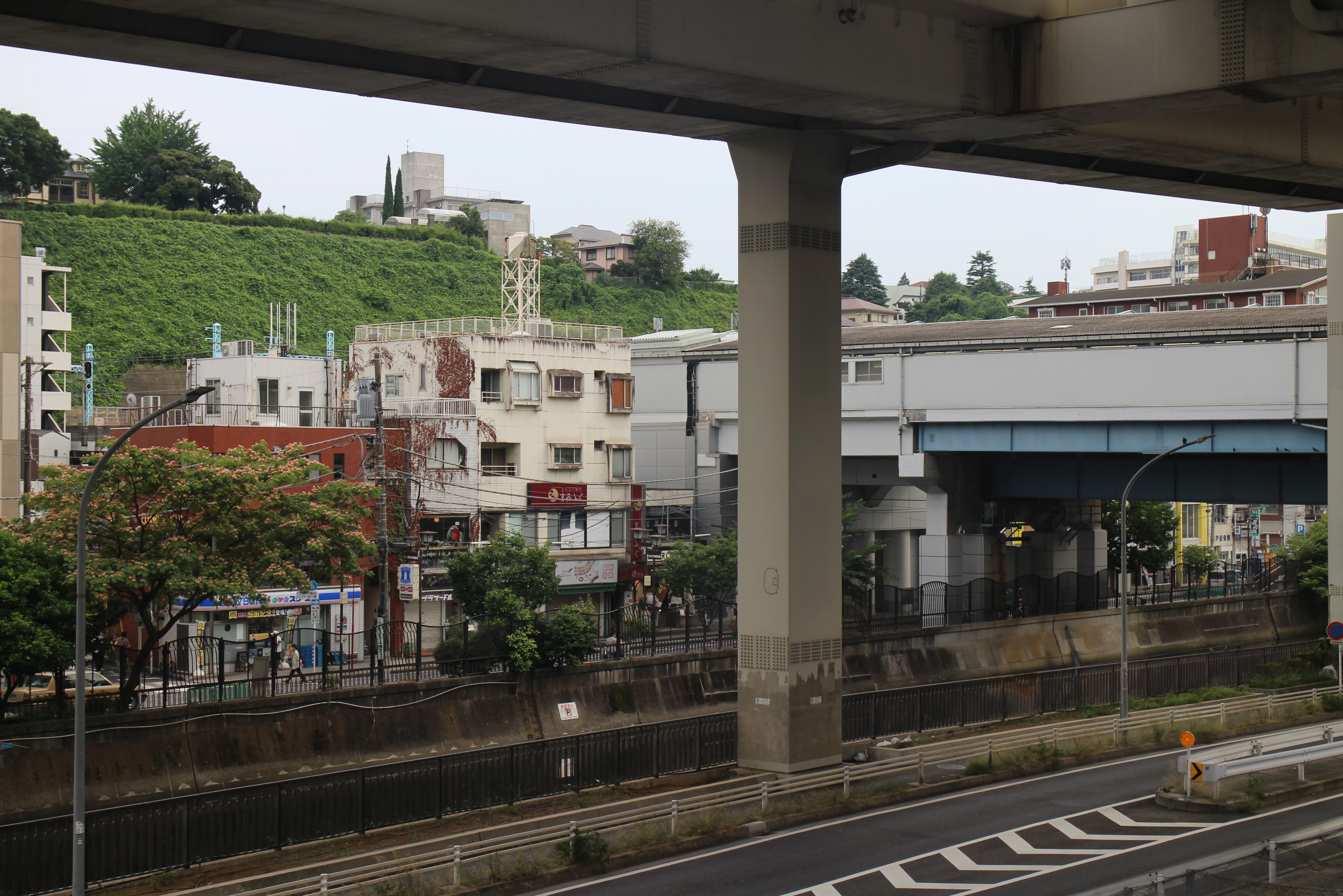 Motorvägen går över Ishikawachō station, som i sin tur grenslar en kanal och skickar tåg mot Negishi-bukten genom en kulle.