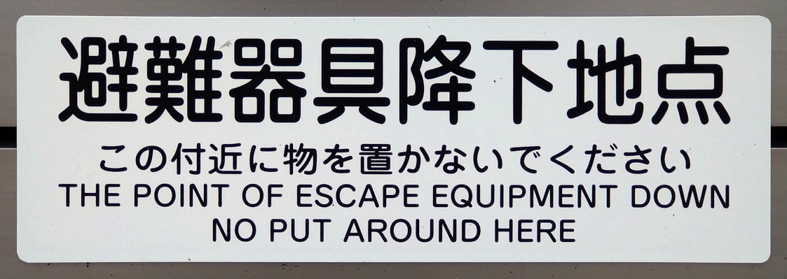 Engrish i stadsmiljön, Kyoto. Skylten sitter lågt på ett staket. Texten betyder egentligen att en brandstege fälls eller firas ner hit, så ställ ingenting i vägen.