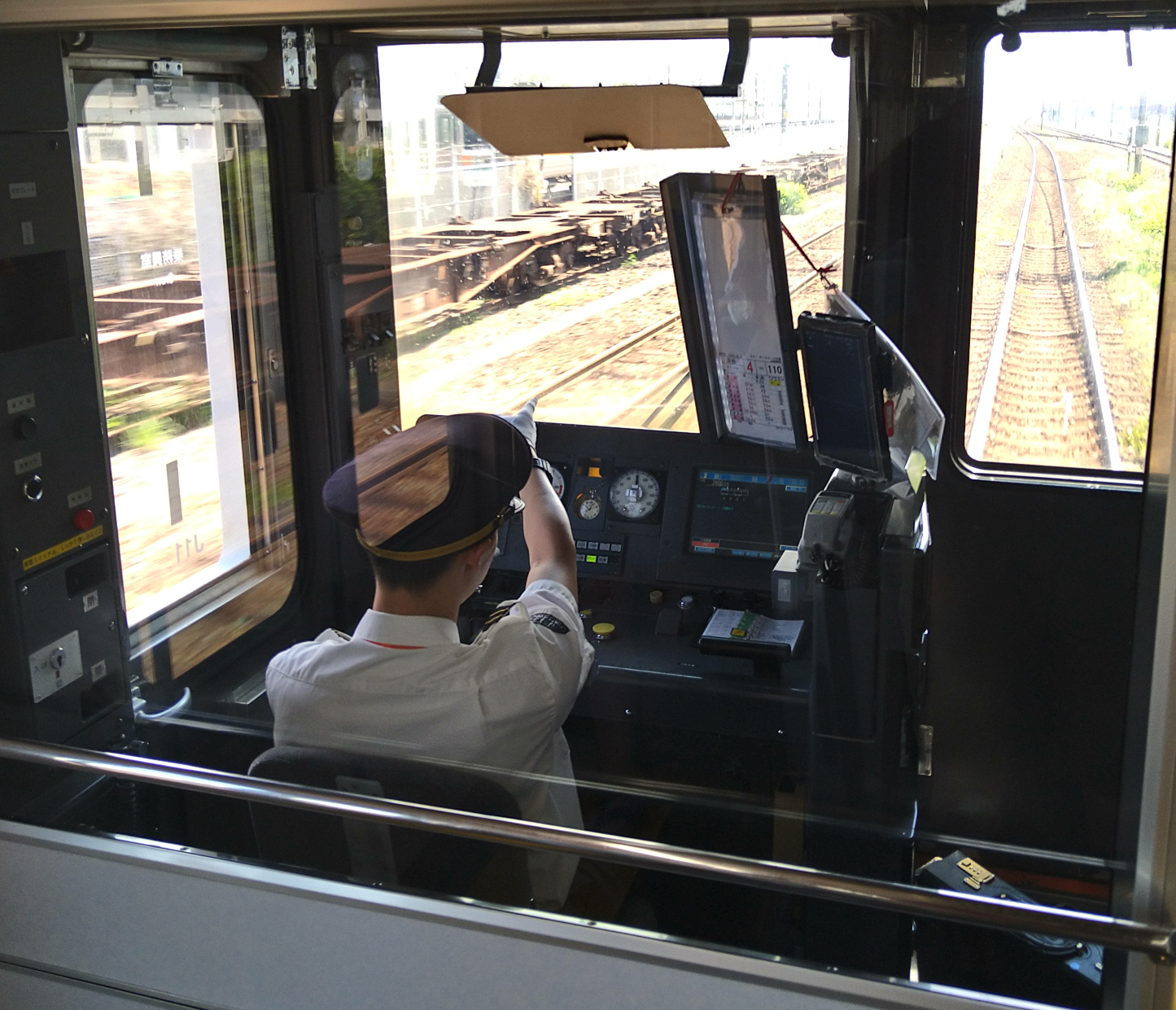 Lokföraren på väg från Maisaka till Hamamatsus centralstation pekar på positionsangivelser längs med spåret och uttalar, ohörd, vad han ser och gör. Detta kallas pointing and calling. Han har sitt fickur i ett särskilt fack mitt på instrumentbrädan som en del av säkerhetsrutinen.