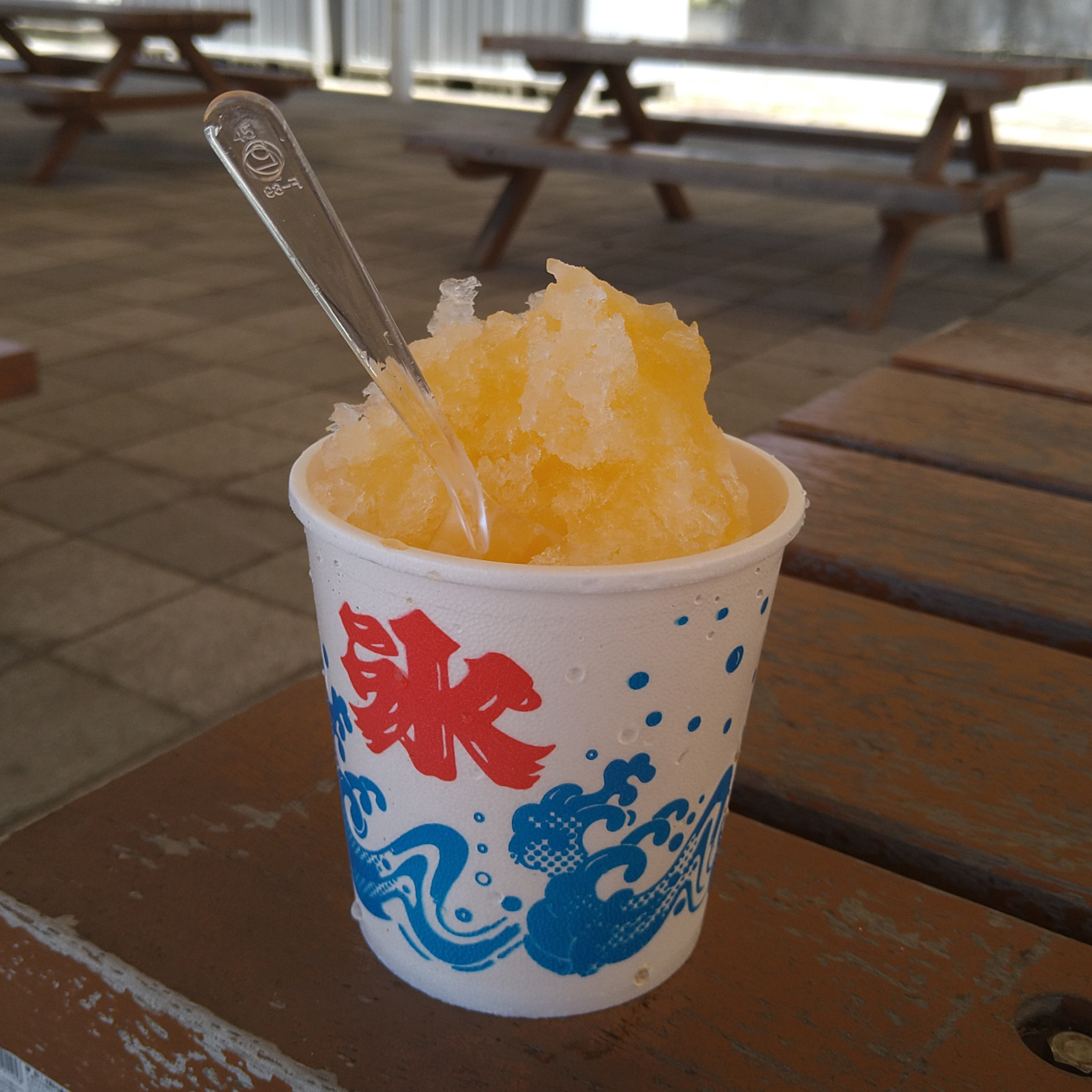 En kopp kakigōri med mangosmak från en food truck på Bentenjimas strand, efter 4 km promenad i sommarsolen.