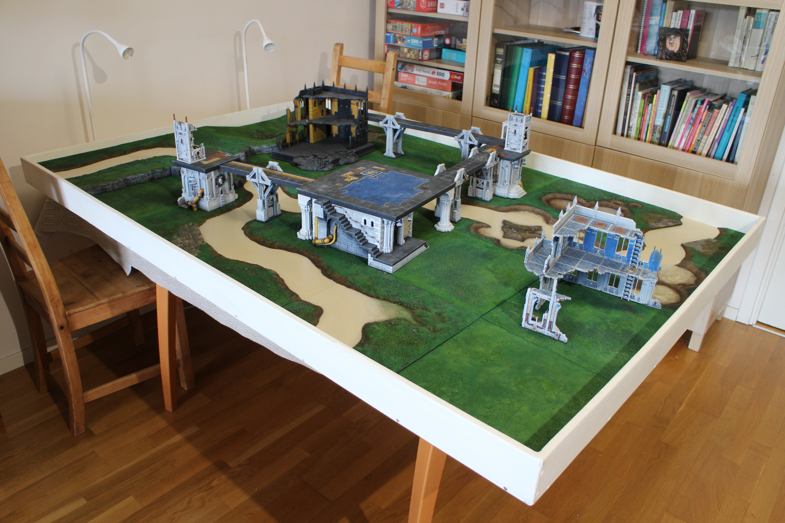 River setup, buildings An example of buildings placed on top of square-foot terrain modules. This uses both the Basilica Administratum and the Sanctum Imperialis. 82 91 35 86 81 37 40 29 85 48 92 94 93 84 88 90 34 24 83 36 61 38 39 89 30 87 In galleries: River setup, 2022wargame board miniature terrain