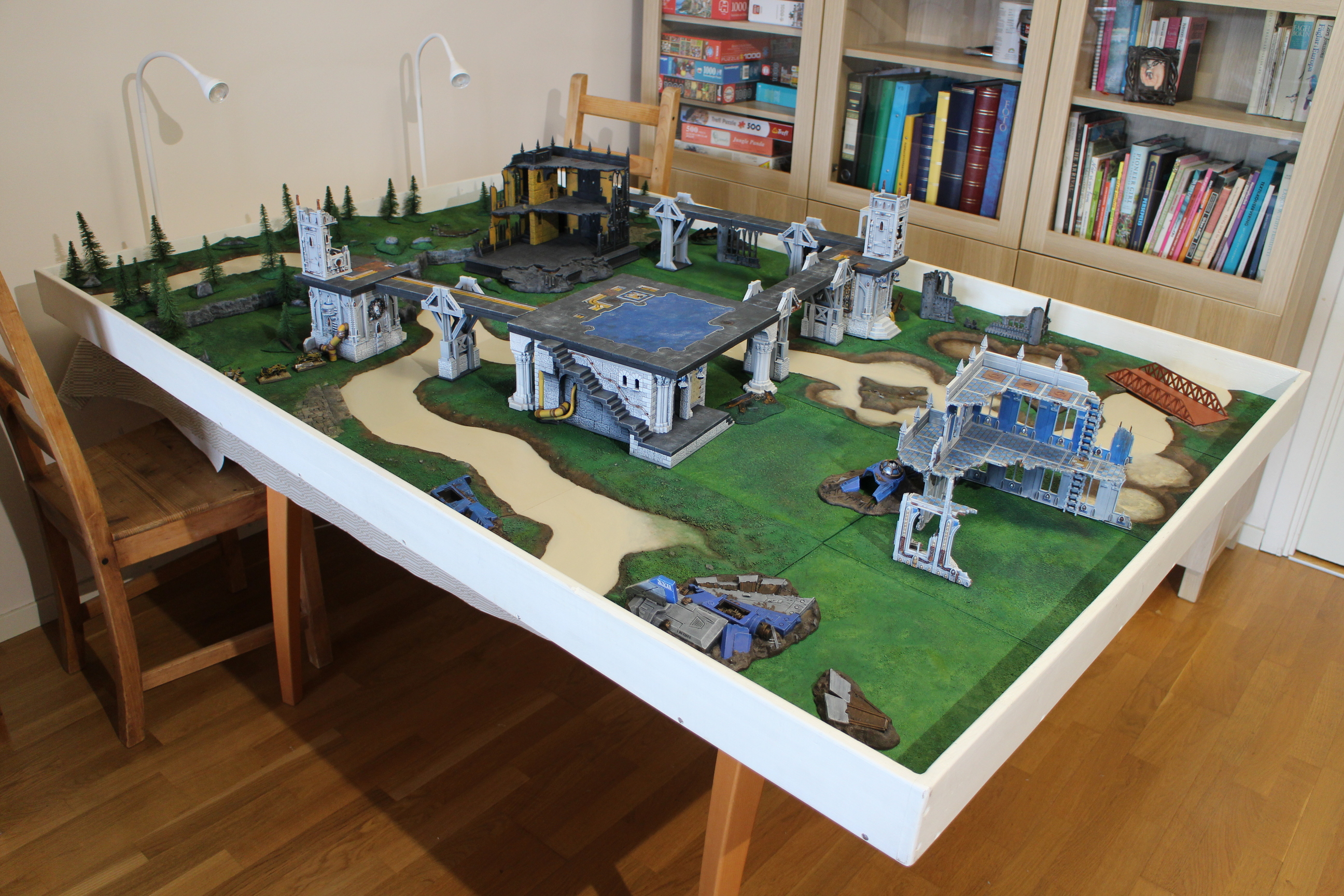 River setup, complete An example of a board ready for a wargaming scenario, with scatter terrain added to the buildings on top of square-foot modules. 87 86 61 89 38 88 94 34 36 91 85 48 90 93 24 35 29 83 30 81 37 92 39 82 84 40 In galleries: River setup, 2022wargame board miniature terrain