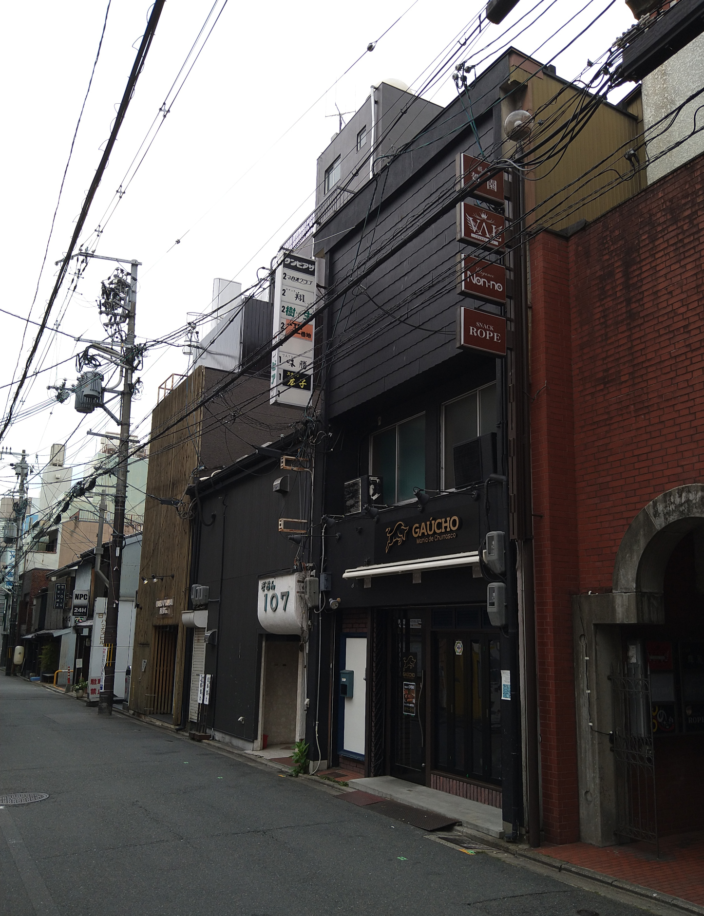 Snack Rope, Elegance Non-no och den brasilianska restaurangen Gaúcho är tre av fem verksamheter som skyltar för sig i det här lilla trevåningshuset på Shinbashi-dōri i östra Kyoto. Ordet “snack” (スナック) används ofta om barer med tilltugg, och “rope” kan vara något annat än det engelska ordet för rep. Enligt Google ligger ett annat Snack Rope i sydvästra Kyoto, och i det fallet skrivs “rope” inte ロープ utan ロペ, vilket antyder antingen total okunskap om engelska eller att transliterationen blivit fel från det spanska namnet Lope eller något annat ord med liknande uttal. Härligt med Engrish-mysterier och tungt belamrade elstolpar.
