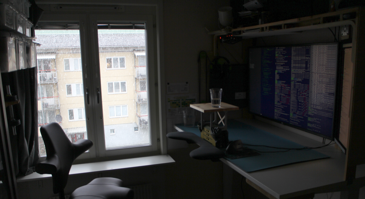 Snön faller utanför hemmakontoret 19 januari 2021.