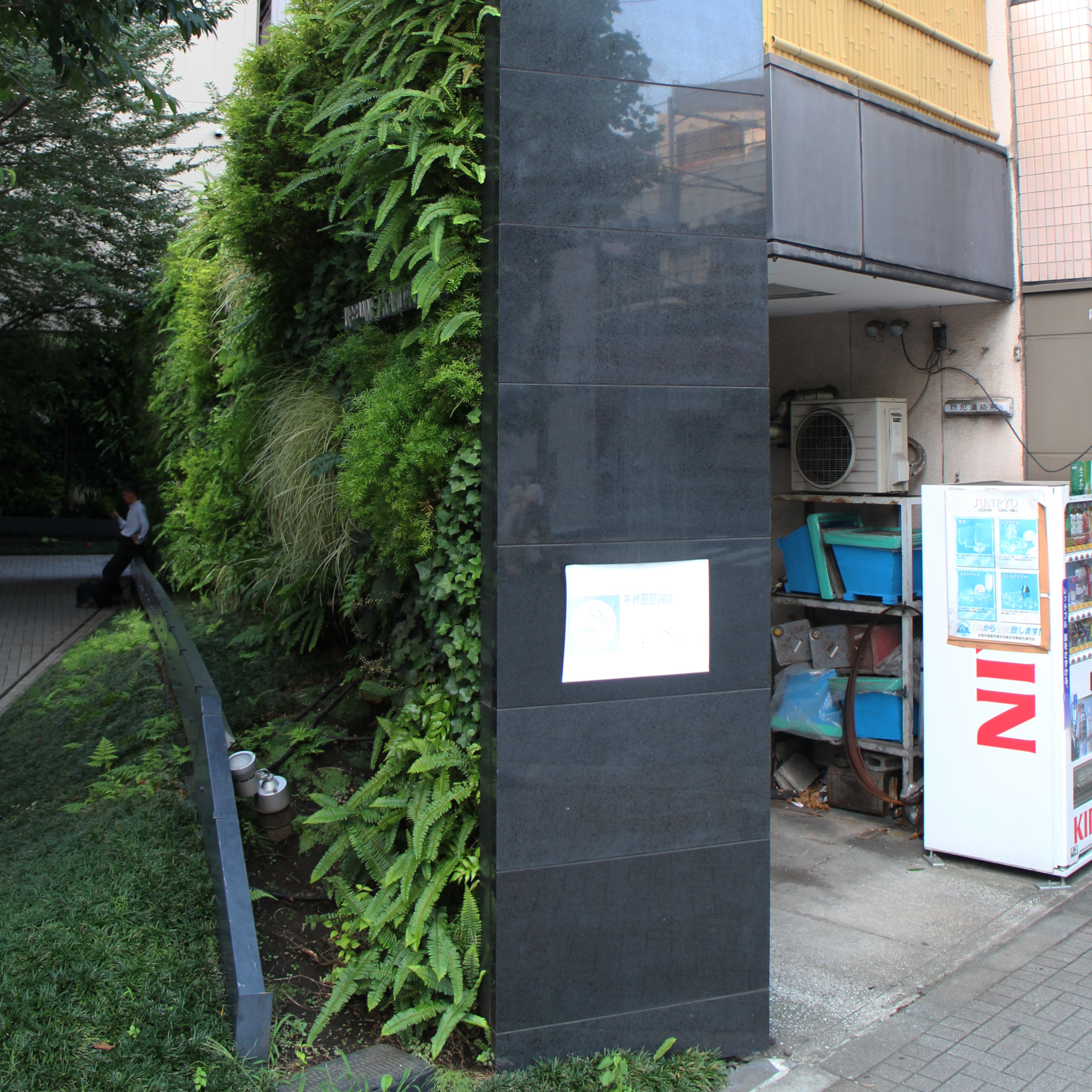 En vägg i Kanda. Väggen står på tomten till vänster, med välslipad sten, någorlunda dolda elkablar och felfri vertikal trädgård. Tomten till höger är något annat, äldre och sjabbigare, med en rostande stålhylla för tomma oljefat och lättbetongblock, krönt av en luftvärmepump. Där intill flygande elkablar, en skylt där det står “kontaktplats för brottsförebyggande verksamhet” (防犯連絡所), en försäljningsautomat med brun tejp och en solblekt reklamaffisch över Kirin-loggan, och slutligen, ovanför allt det, ett balkongräcke av sannolikt falsk bambu.