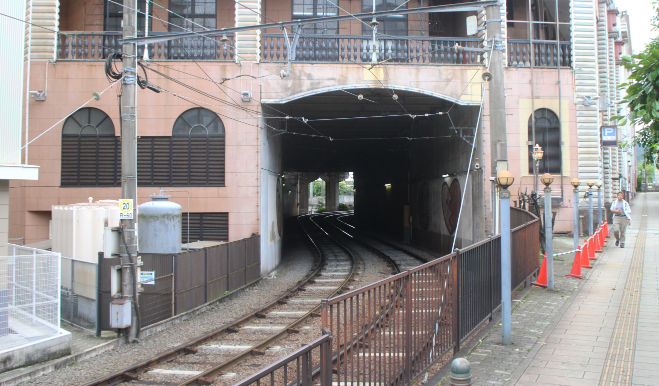 Den här byggnaden, Nagasakis centrum för byggnader i västerländsk stil (長崎西洋館センター), har uppenbarligen ritats för att passa ovanpå stadens spårvagnar.