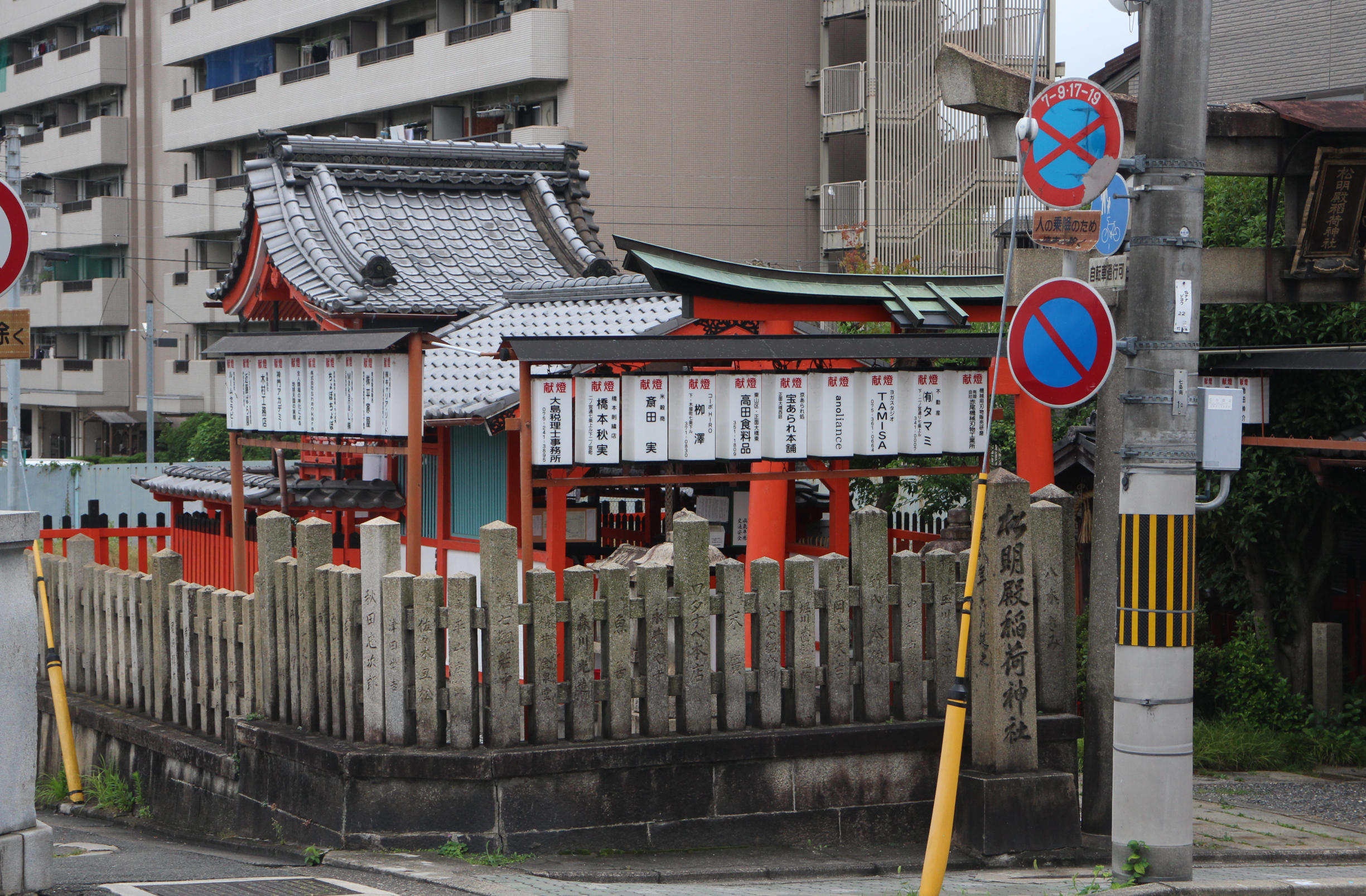 Det här är Taimatsuden Inari-jinja, en liten shintō-helgedom vid västra fästet till Shichijō-bron över floden Kamo. Helgedomen domineras visuellt av ett stenstaket och två rader av elektriska lyktor mot gatan. Både stenarna och lyktorna bär namn på lokala företag, som Yogastudion Tamisa och Watanabes bokhandel. Jag förmodar att företagen bidragit till helgedomens uppförande eller restaurering, men detta är mest reklam. Flera av sponsorerna står angivna med telefonnummer för att locka kunder.