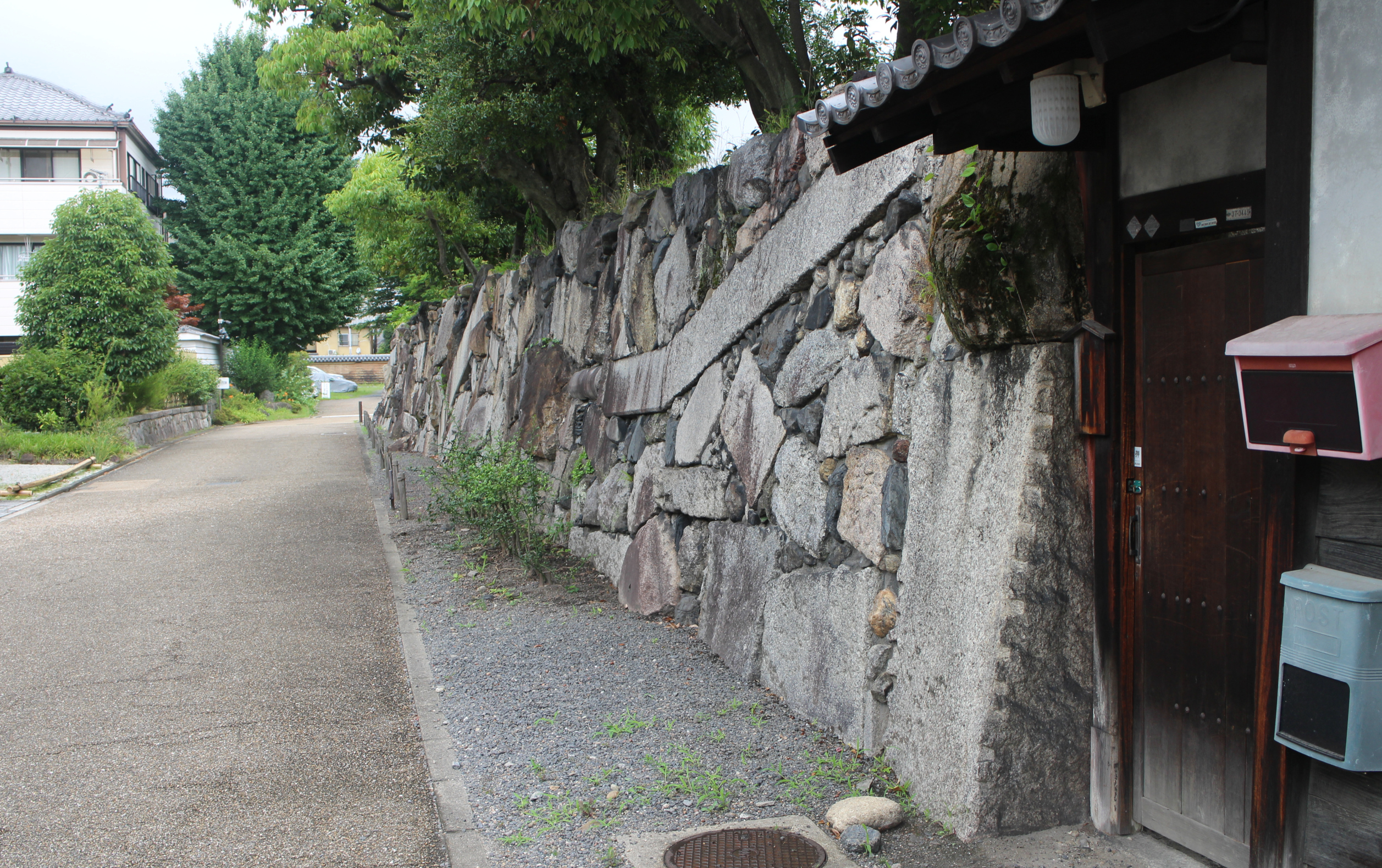 Shōsei-ens broschyr säger bara det uppenbara om den här muren: Att i den ingår sten från olika källor, inklusive takplattor, kvarnstenar, hörnstenar, långa block av den sort som används i broar, och obearbetad sten från bergen. Den heter också bara “Höga stenmuren”, Taka-ishigaki (高石垣).