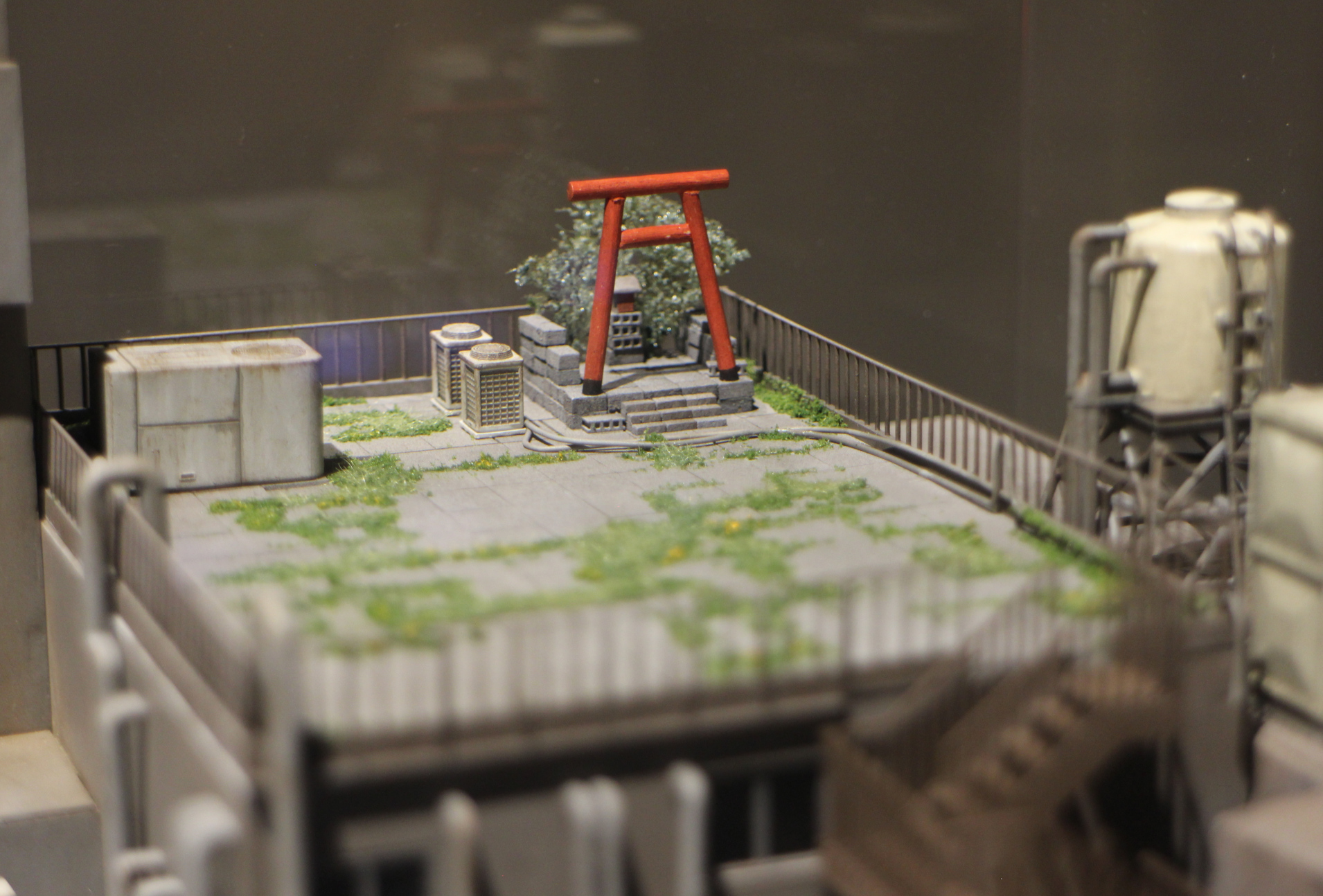 Majiris modell av en verklig byggnad i Shibuya har ett overkligt inslag: Den här lilla helgedomen av lättbetong. Helgedomen kommer från filmen Weathering with You (2019). Ödehuset Yoyogi Kaikan revs i verkligheten 2020.
