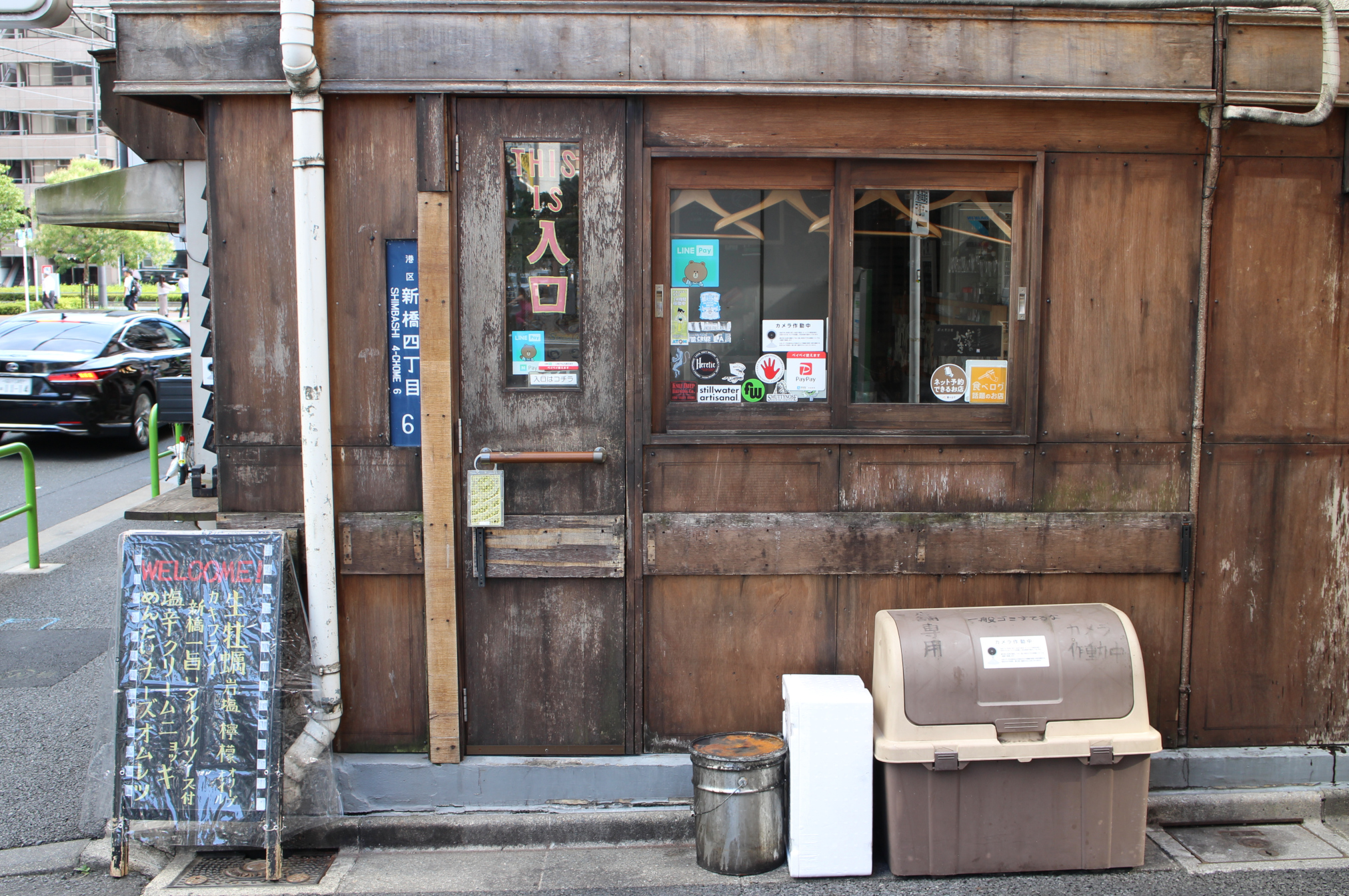 Väl patinerad träfasad med smal entré till en kvarterskrog i Shinbashi. 入口 är inte krogens namn; det betyder “ingång”.