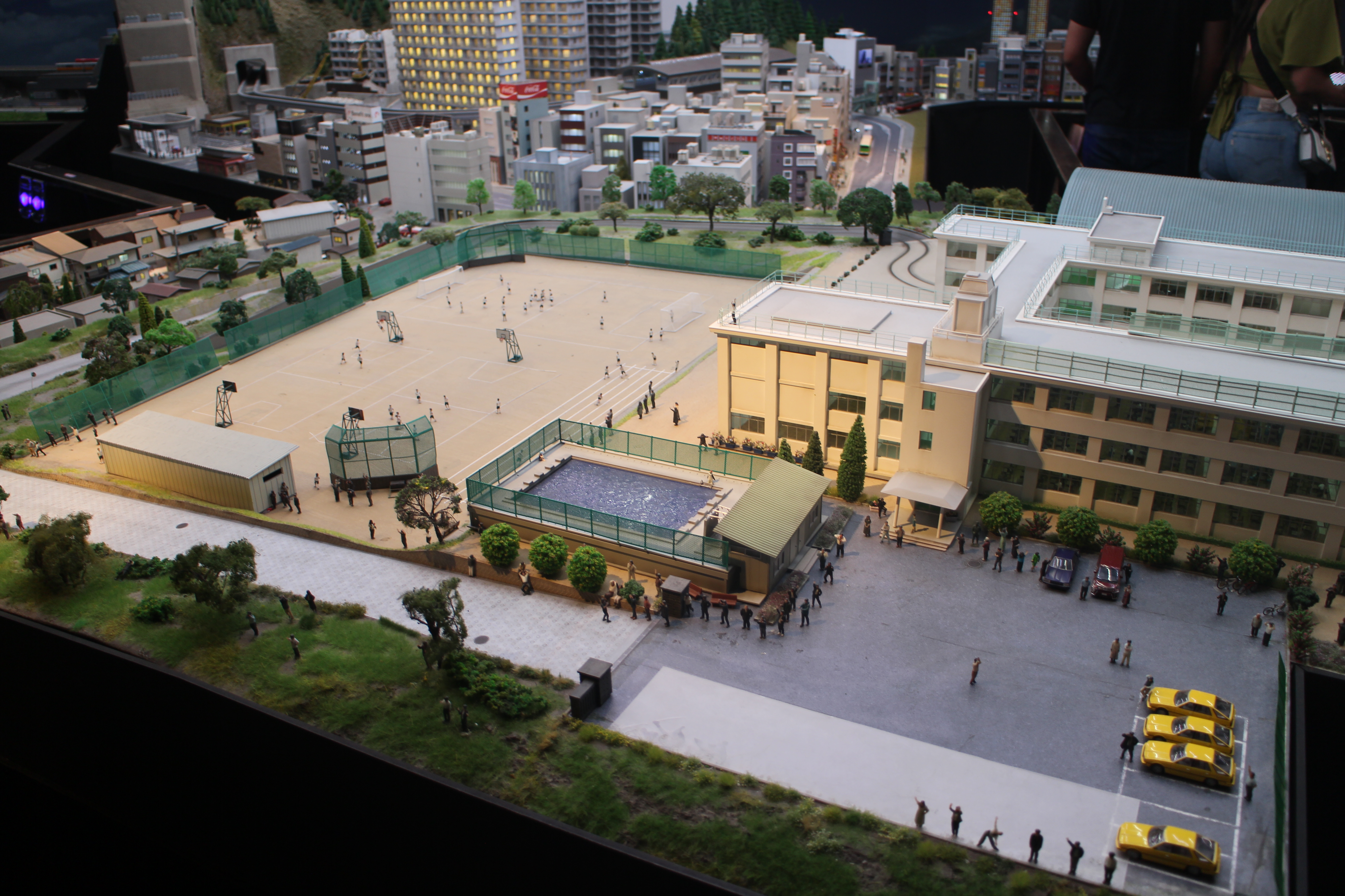 Rei och Pen-Pen är båda vid simbassängen i den här modellen på Small Worlds. I bakgrunden Rivningsarbete i Tokyo-3.