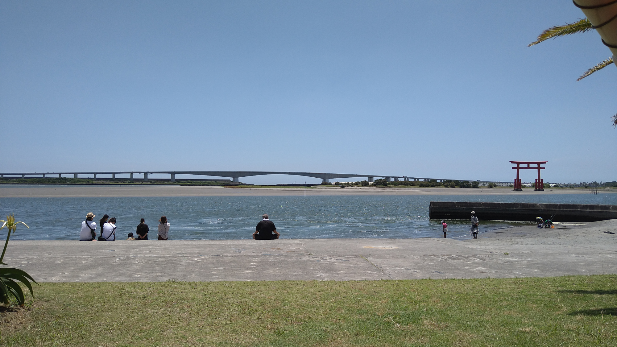 Den röda toriin står på ett rev innanför sundet mellan Hamanako och havet. I bakgrunden Hamanako-bron som går över sundet. Sanden är grå och vattnet strömt. I förgrunden en plattform av betong med samma färg som sanden.