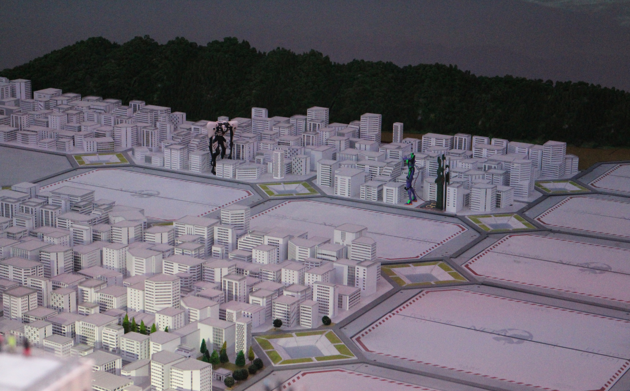 Höghusen hissas ner för den scen som avslutar första avsnittet av Neon Genesis Evangelion (1995). Jämför Centrala Tokyo-3 under gyllene timmen, där husen är uppe. De hissas upp och ner till rätt musik från serien.