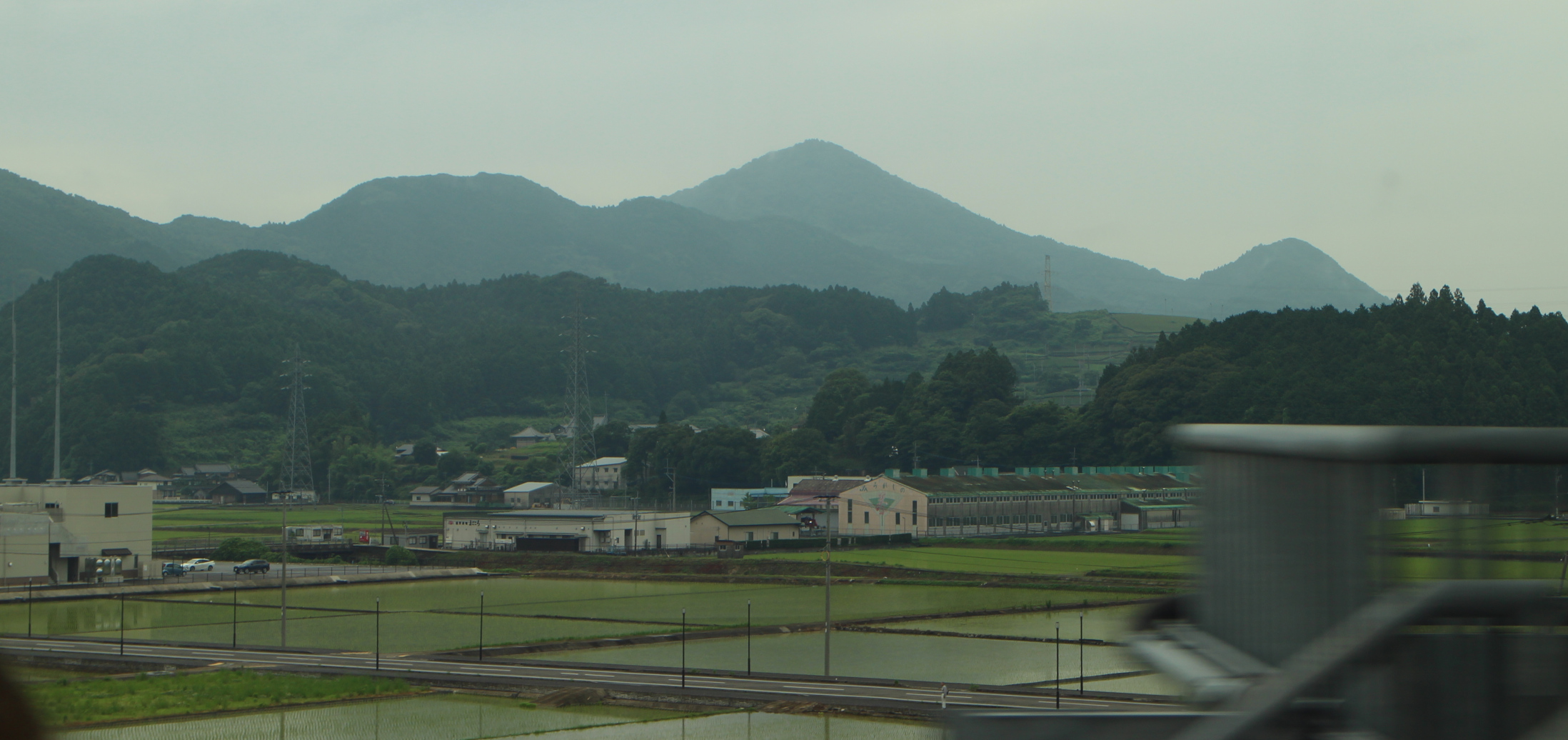 Den japanska landsbygden sedd från ett snabbtåg är lite enformig, men formen är roligare än städernas. Skogar identiska med kullar och berg tornar över små och stora samhällen med oändligt varierade småhus, småskaliga jordbruk och enstaka industrier som denna. Fabriken heter JAさが みどり地区嬉野大型製茶工場. Foto taget från Kamome-tåg på Kyūshū.