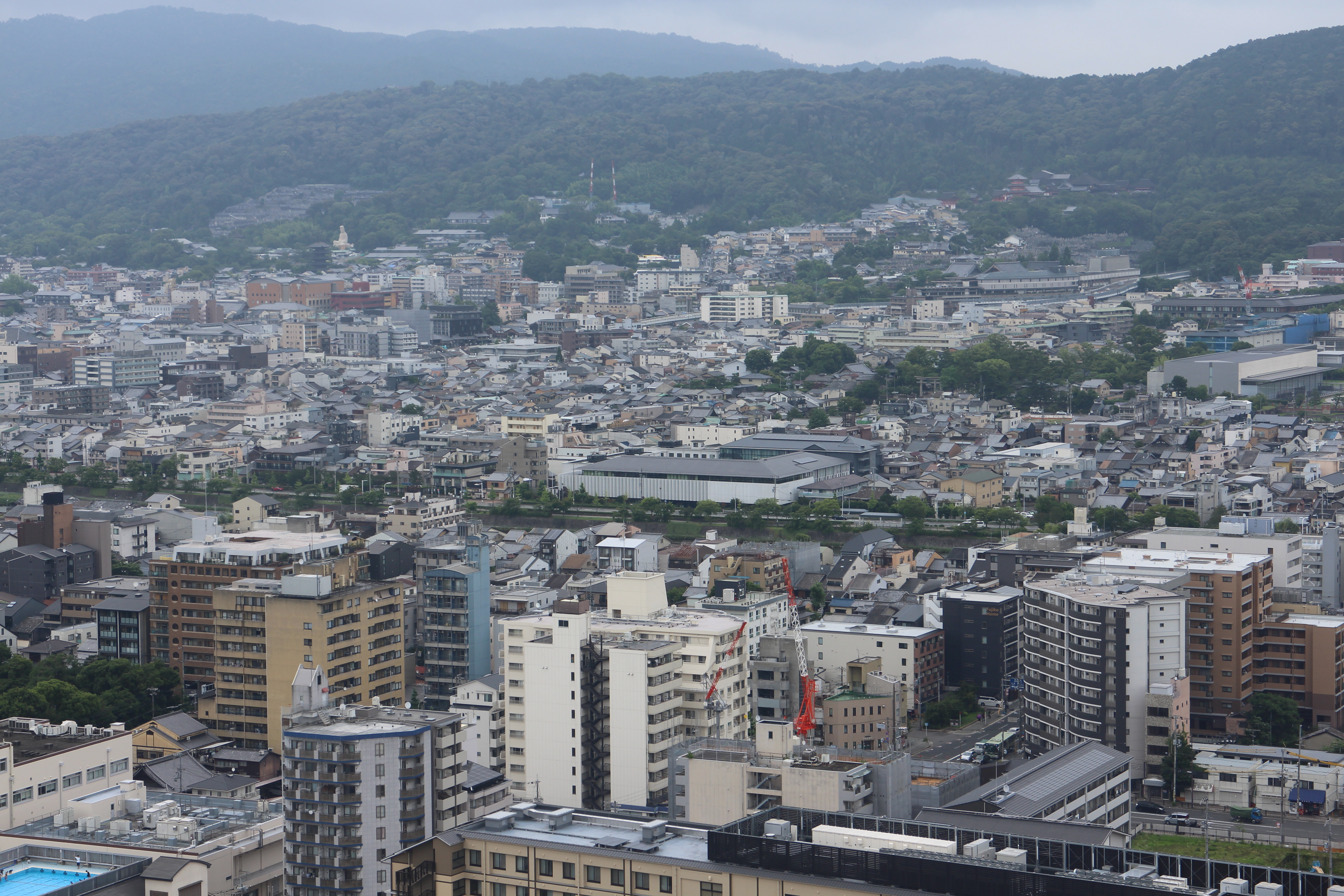 Uppe till vänster i bild gravfältet i Higashi Ōtani (östra stora dalen). Uppe till höger helgedomen Kiyomizudera. Den stora byggnaden vid floden Kamo i mitten av bilden är Kyotos hantverksuniversitet.