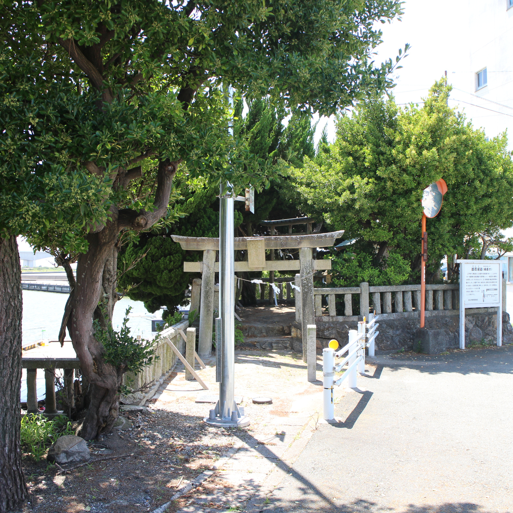 En kompakt men vacker shintō-helgedom i Maisakas fiskehamn omges av små träd. Den vita skylten vid helgedomen berättar om färjeläget Minamigange, men helgedomen är istället tillägnad själva vattnet. På skylten ovanför betongtoriin står det suijingū (水神宮), “vattenhelgedom”.